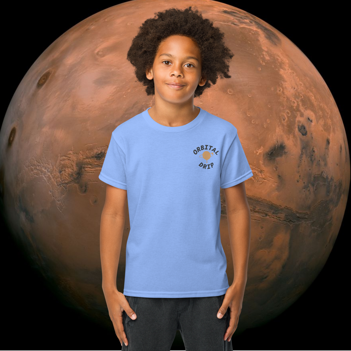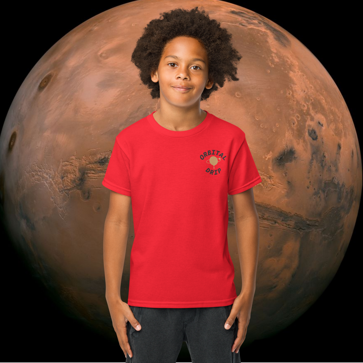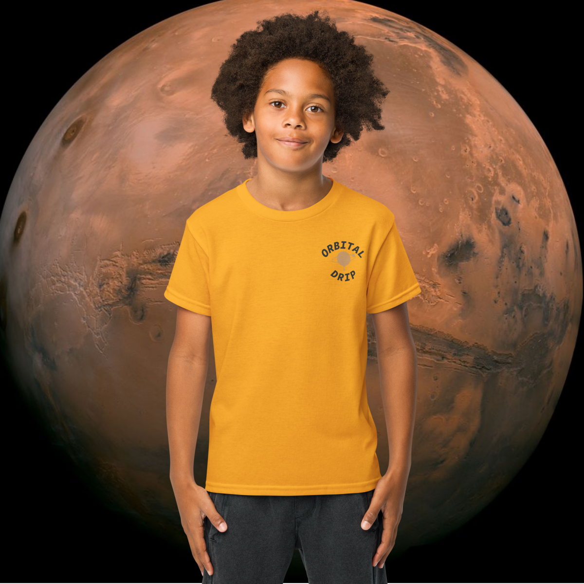 The Mars Youth Tee from our Terrestrial Drip series keeps kids cool, comfortable, and ready for adventure. Crafted with a cotton-poly blend and moisture-wicking fabric, it’s lightweight, breathable, and built to handle active days while showcasing the rugged beauty of Mars. With a modern fit and durable construction, this tee is perfect for school, play, or stargazing nights.
